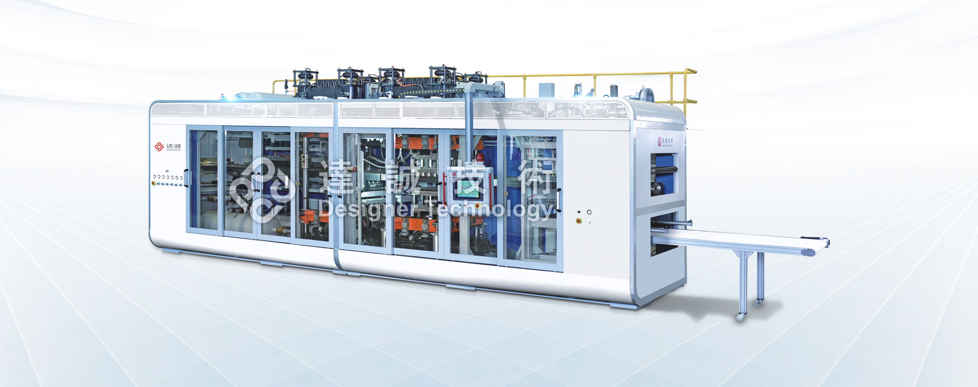 成型工位、沖孔工位、沖剪工位采用上下兩組伺服電機控制,驅(qū)動偏心輪連桿結構分別帶動兩模臺上下運動并配備正負壓氣源,可實現(xiàn)產(chǎn)品正負壓成型。